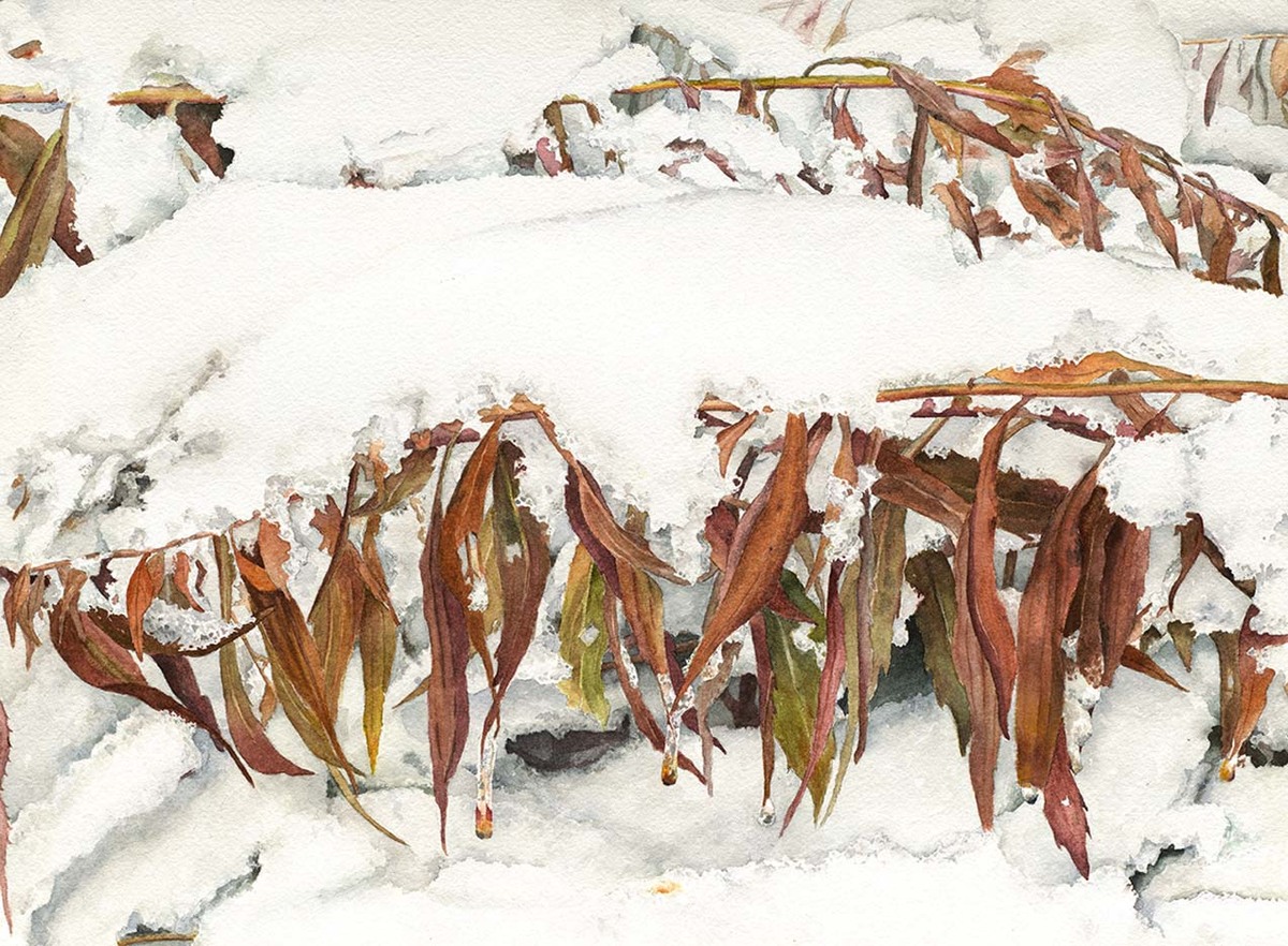 The inspiration for this painting came from a photo I took on a snowy day while on a walk with my husband at a park near our home. The snow was so heavy that the weeds were weighed down and bent over under the weight of the snow, making a beautiful scene for this painting.