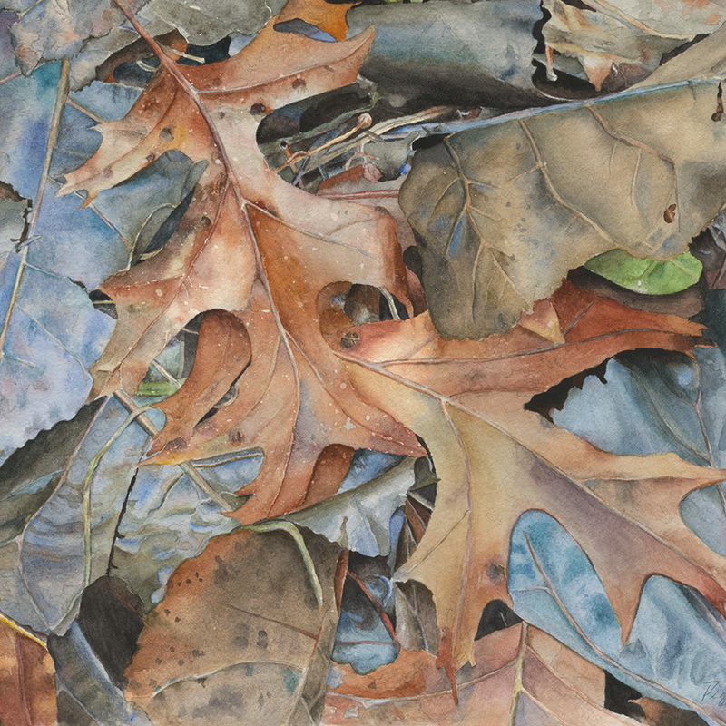 I found the inspiration for this painting in my backyard in the late fall. The leaves were wet from a recent rain and the cottonwood had a blue tint to it. It's one of my favorite paintings. I love the colors in it.