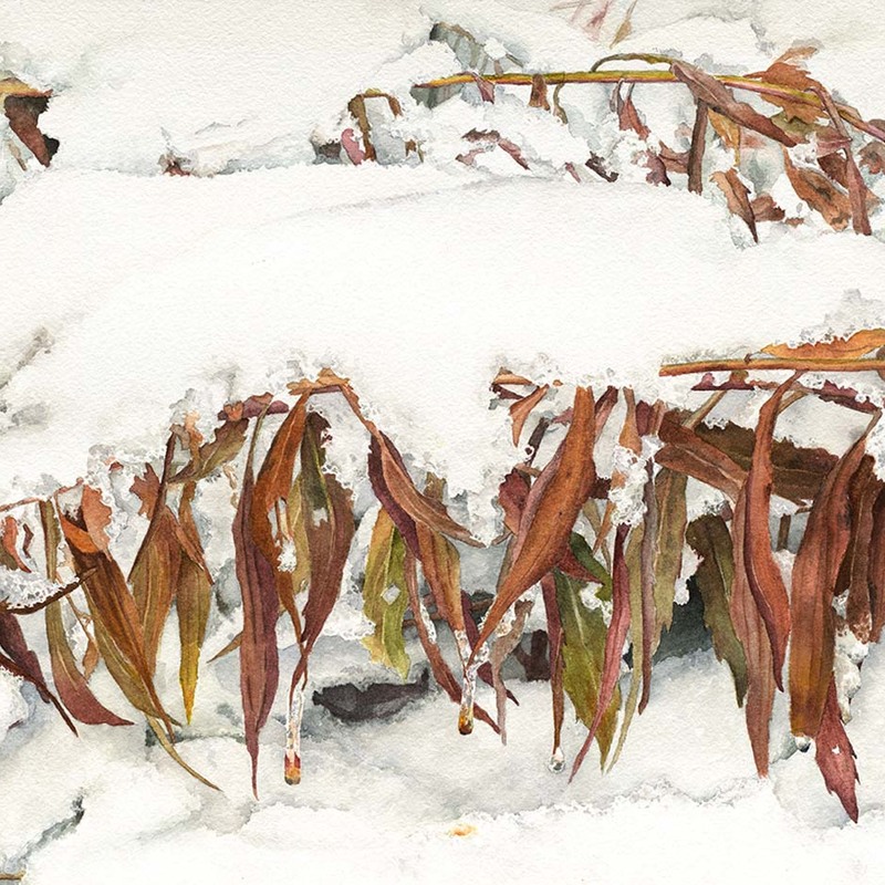 The inspiration for this painting came from a photo I took on a snowy day while on a walk with my husband at a park near our home. The snow was so heavy that the weeds were weighed down and bent over under the weight of the snow, making a beautiful scene for this painting.